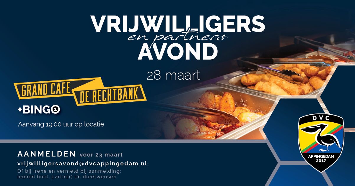 Op de flyer is te lezen dat het in Appingedam plaats gaat vinden en dat opgave verplicht is bij Irene. Dit mag via het genoemde mailadres vrijwillgersavond@dvcappingedam.nl maar mag ook persoonlijk (via app) naar haar.