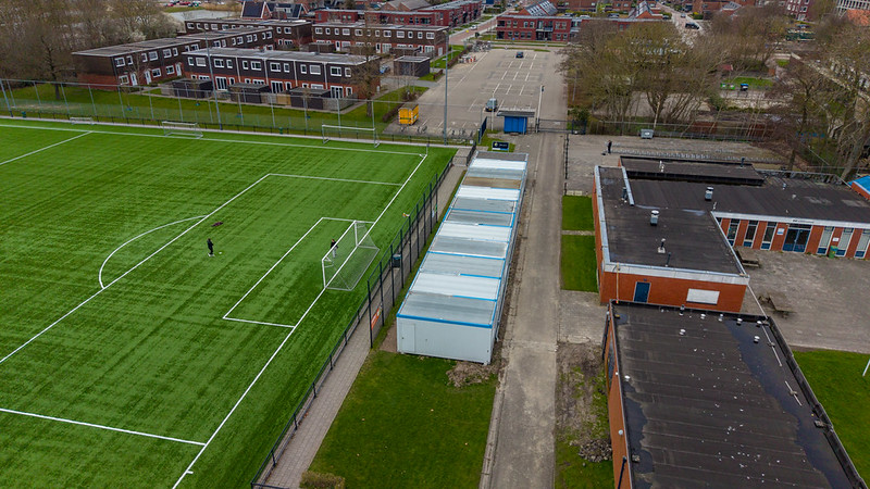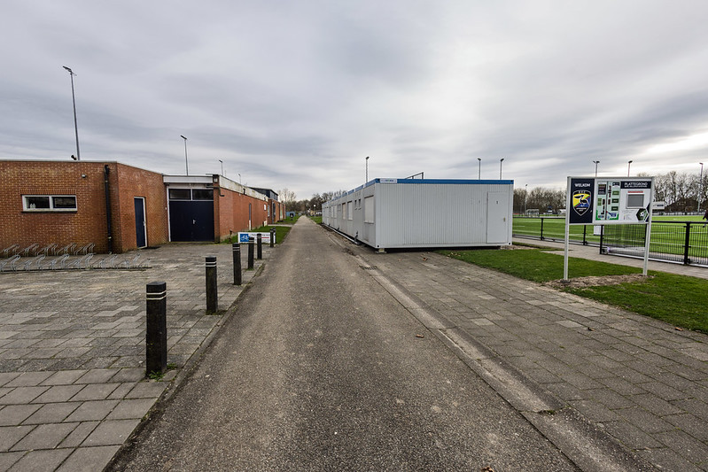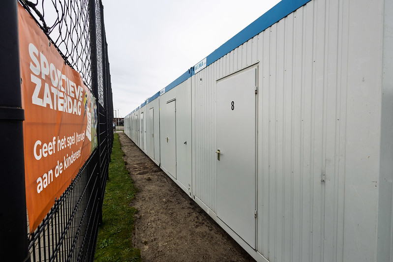 Zoals te zien bij de ingang van het sportpark zijn 8 kleedkamerunits incl. douches geplaatst. Deze units worden in gebruik genomen als de stroom naar de bestaande kleedkamers is afgesloten. Er komt nog een tegelpad voor de units, daarvoor worden de tegels gebruikt die voor de tribune liggen.